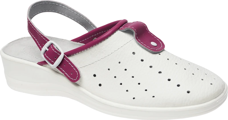 Модель предназначена для работников сферы обслуживания, текстильной, пищевой и легкой промышленности, медицинских работников, обслуживающего персонала. Белые сабо с ярким красным ремешком в качестве элемента декора понравятся молодым и взрослым женщинам
