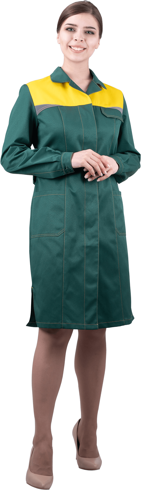 Покупайте Халат женский КМ-10 ЛЮКС от механических воздействий и ОПЗ, зеленый/желтый по цене 1067.5 руб. оптом или в розницу в магазине спецодежды СнабТим. Большой выбор защитной одежды, СИЗ и других хозтоваров в Набережных Челнах. Заказывайте онлайн или по телефону +7 (991) 190-59-22