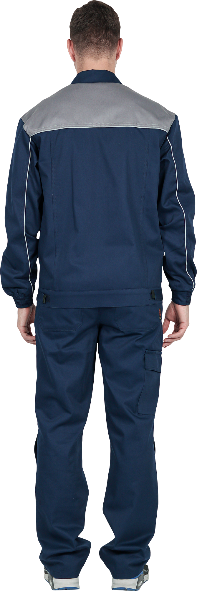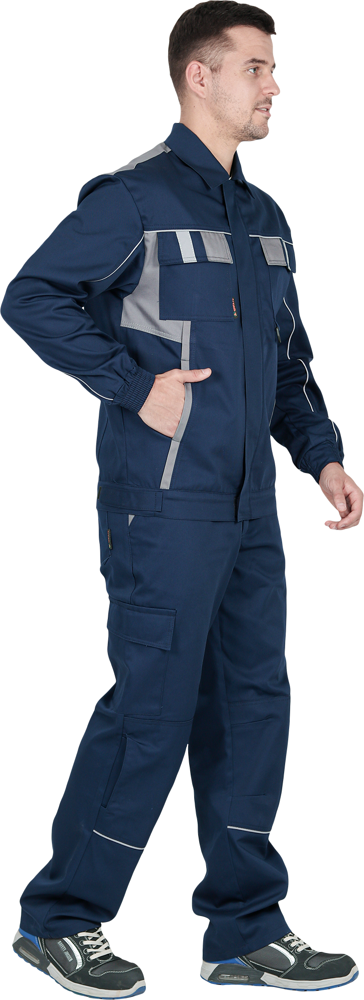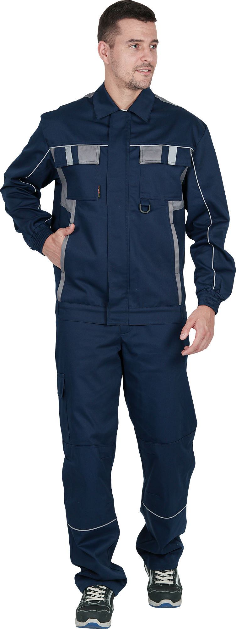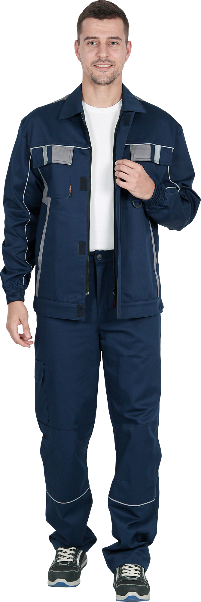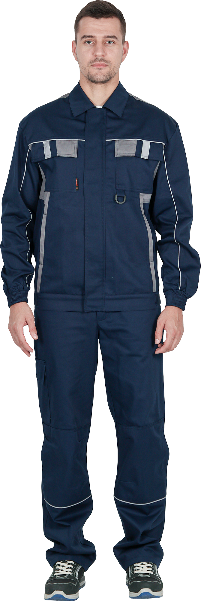 Костюм состоит из куртки и брюк.Со световозвращающим кантом по нижнему краю кокеток полочек и спинки,по переднему и локтевому швам рукавов, по нижнему краю наколенников.Куртка:• прямого силуэта с притачным поясом• спинка и полочки с кокетками• центральная застёжка на молнию• ветрозащитный клапан с текстильной застёжкой• отложной воротник• нагрудные накладные карманы с клапанами с текстильной застёжкой• нижние накладные карманы с наклонным входом• рукава трёхшовные с манжетами• манжета рукава частично с эластичной лентой• ширина куртки внизу регулируется патами на поясеБрюки:• пояс частично с эластичной лентой на уровне боковых швов• застёжкой-гульф на молнию• наколенники с кармано