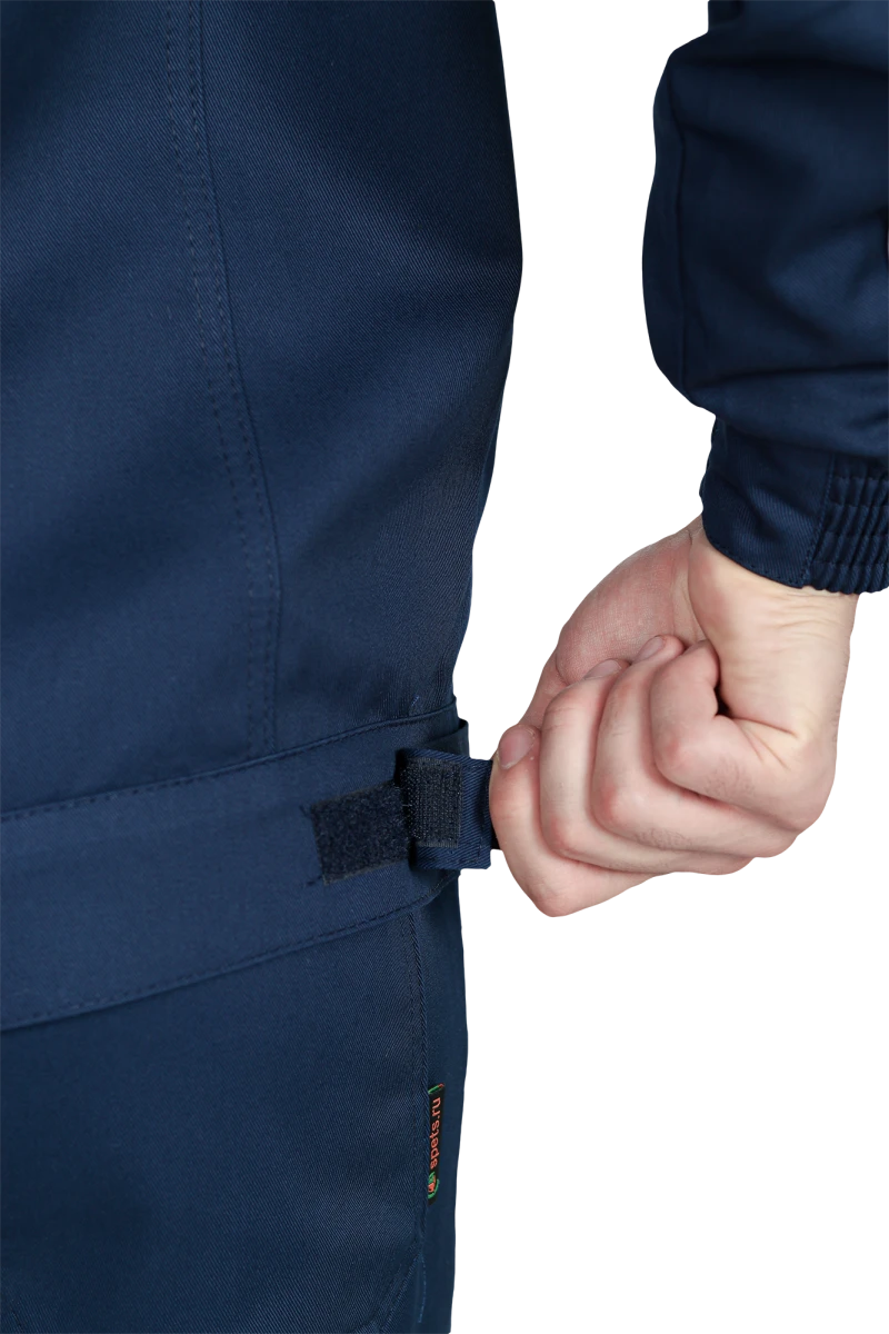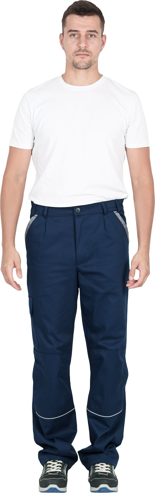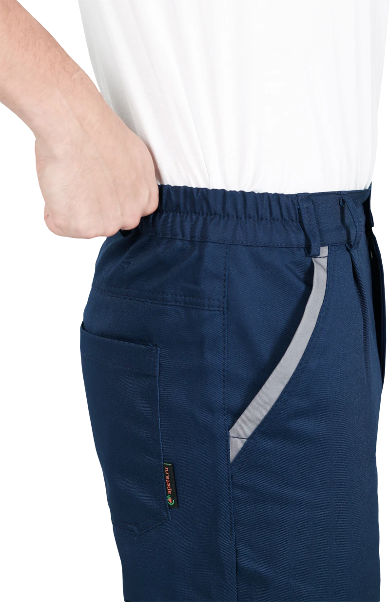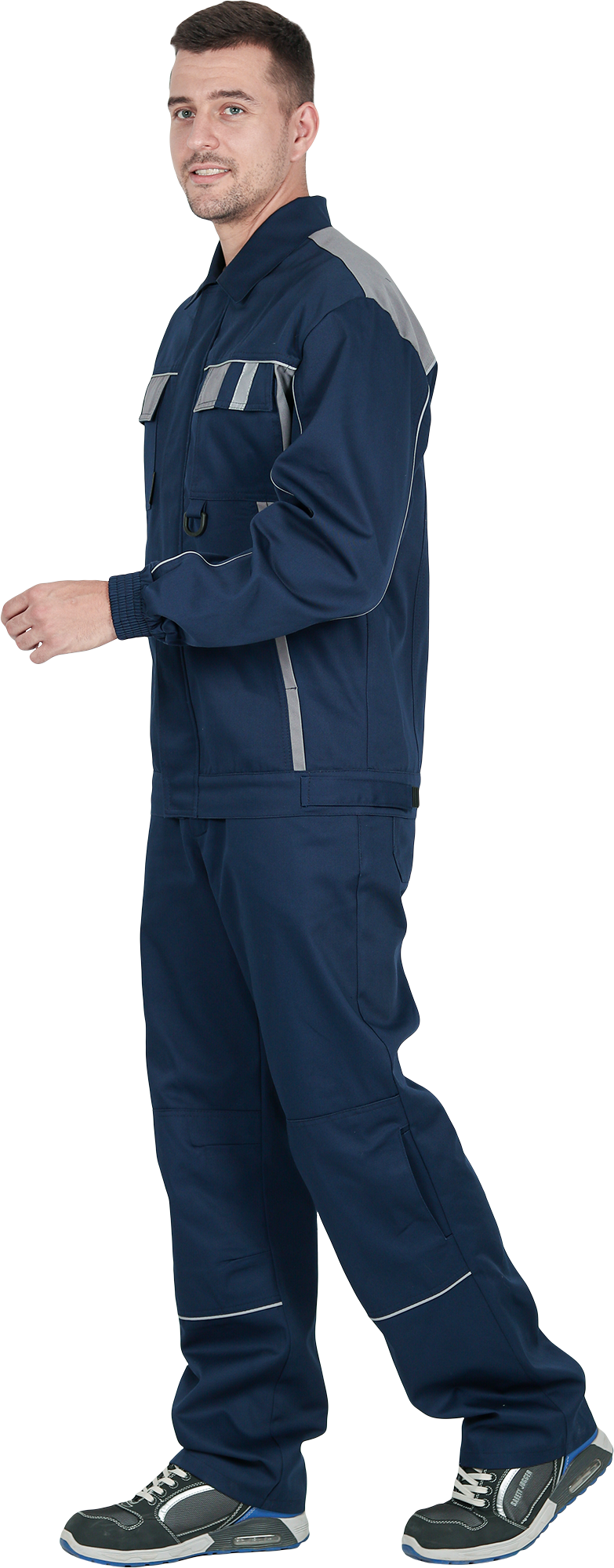Костюм состоит из куртки и брюк.Со световозвращающим кантом по нижнему краю кокеток полочек и спинки,по переднему и локтевому швам рукавов, по нижнему краю наколенников.Куртка:• прямого силуэта с притачным поясом• спинка и полочки с кокетками• центральная застёжка на молнию• ветрозащитный клапан с текстильной застёжкой• отложной воротник• нагрудные накладные карманы с клапанами с текстильной застёжкой• нижние накладные карманы с наклонным входом• рукава трёхшовные с манжетами• манжета рукава частично с эластичной лентой• ширина куртки внизу регулируется патами на поясеБрюки:• пояс частично с эластичной лентой на уровне боковых швов• застёжкой-гульф на молнию• наколенники с кармано