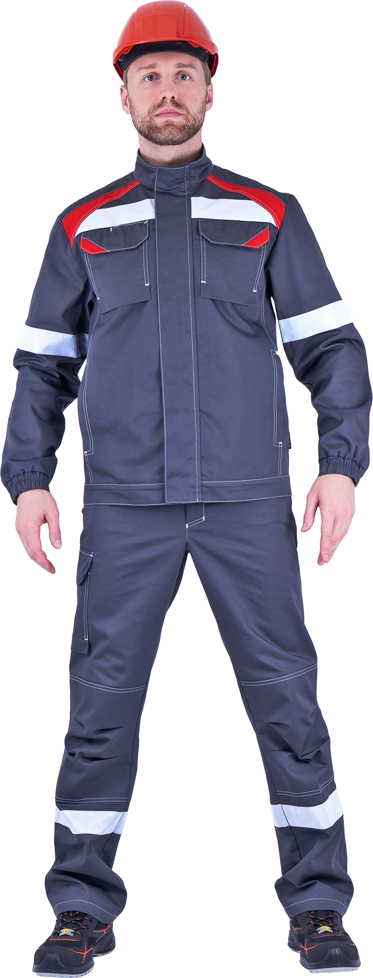 Купить Костюм мужской СТАРАТЕЛЬ от механических воздействий и ОПЗ (куртка, брюки), серый/красный вы можете в компании СнабТим, оформив заказ в интернет магазине, или