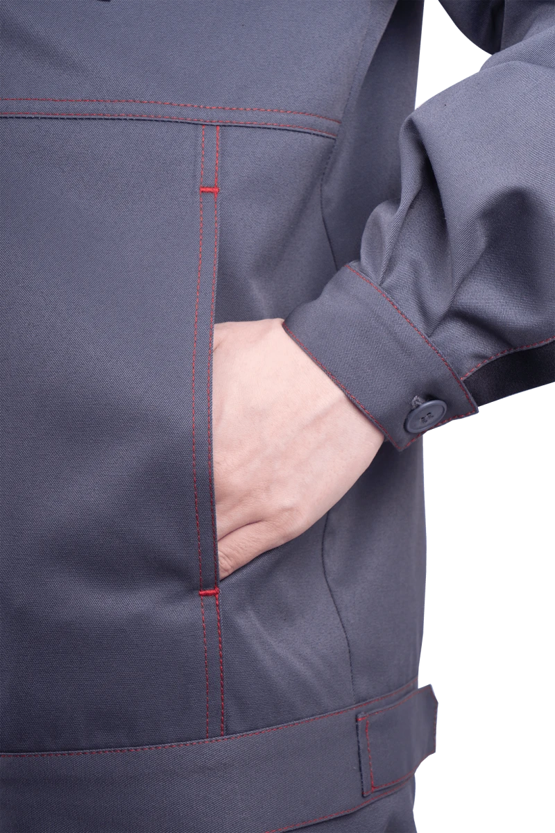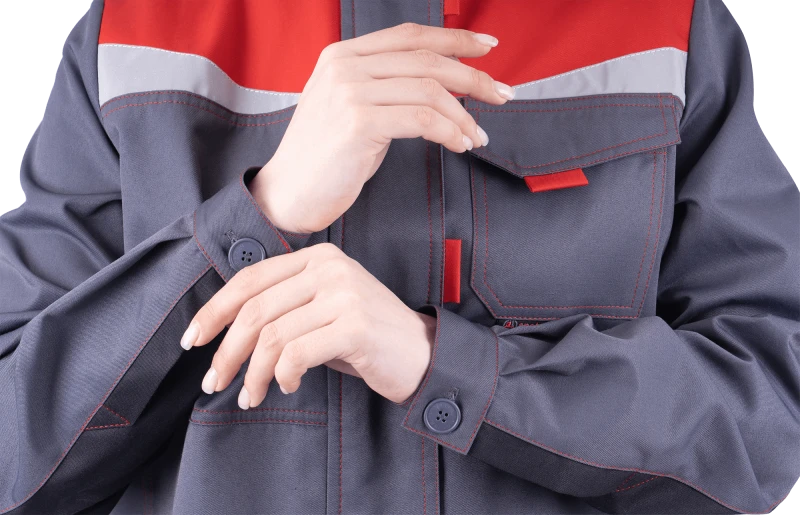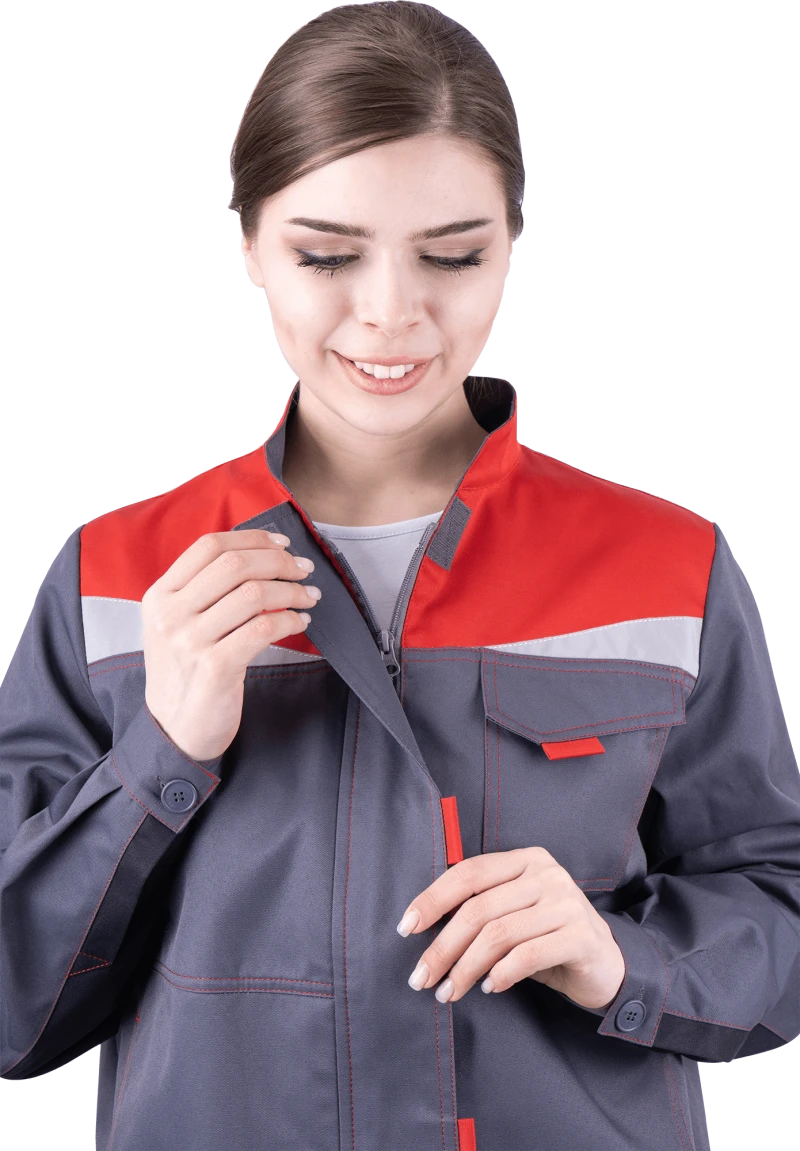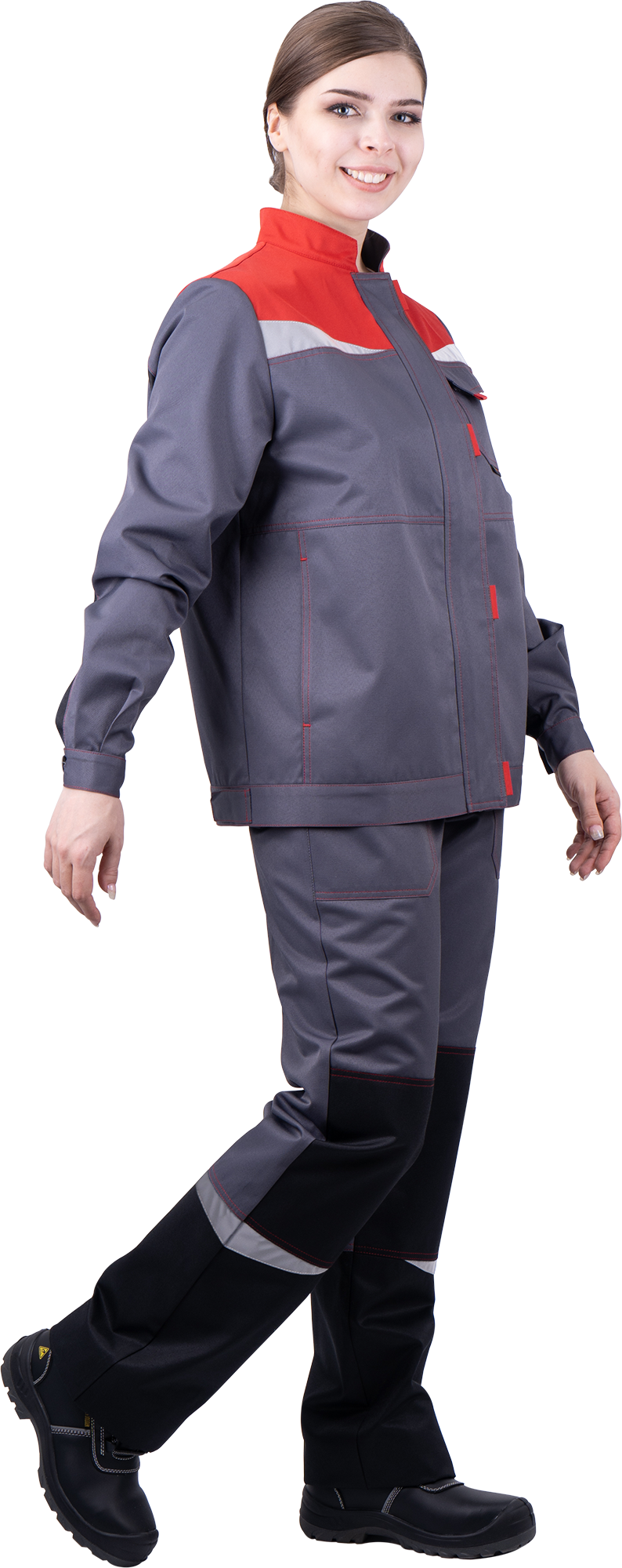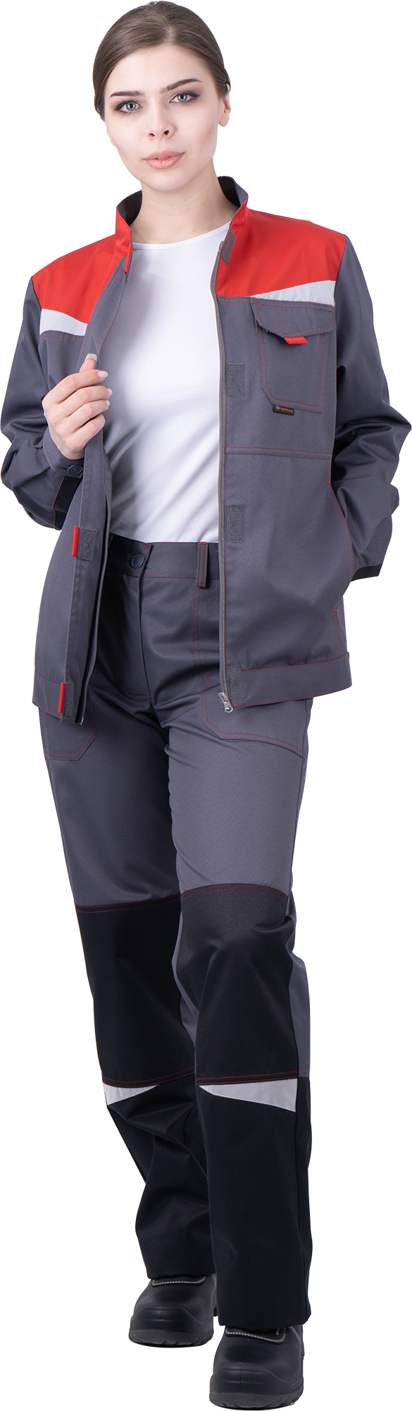 Костюм женский КМ-10 ЛЮКС от механических воздействий и ОПЗ (куртка, брюки), серый/красный/черный