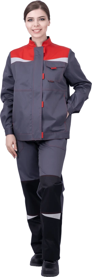 Костюм женский КМ-10 ЛЮКС от механических воздействий и ОПЗ (куртка, брюки), серый/красный/черный