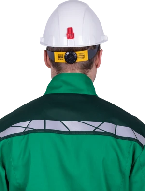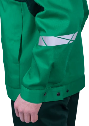 • термоклеевая световозвращающая полоса шириной 30 мм располагается по кокеткам полочек и спинки, низу центральной части рукавов