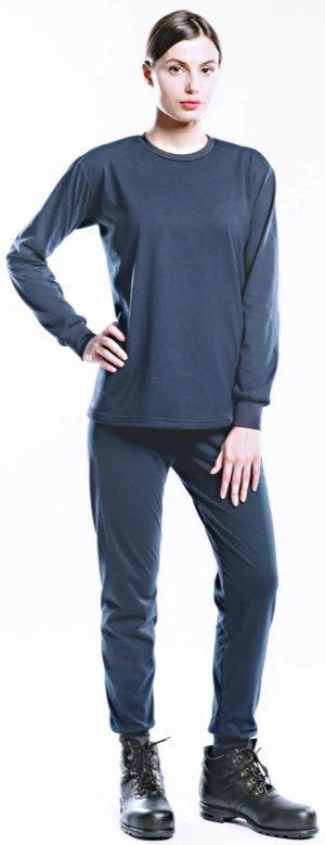 Белье рекомендовано для усиления защитных свойств костюма. Состоит из фуфайки и брюк. Фуфайка прямого силуэта, с втачными рукавами с притачными манжетами. Горловина фуфайки обработана обтачкой. Брюки состоят из двух половинок, без боковых швов, по низу притачные манжеты. Белье идеально облегает фигуру, не стесняя движений.