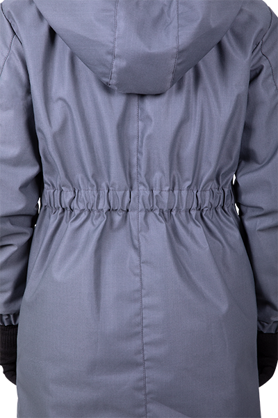центральной бортовой потайной застежкой на пять пуговиц, с втачным капюшоном. На полочках боковые накладные карманы с клапанами, застегивающимися наленту-контакт, настроченные на нижние клапана и карманы. Наружные стороны боковых карманов имеют дополнительные объемы. Спинка со средним швом.
