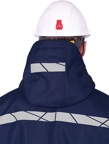• термоклеевые световозвращающие полосы шириной 30 мм на кокетках полочки и спинки, внизу рукавов, брюк, на центральной части капюшона