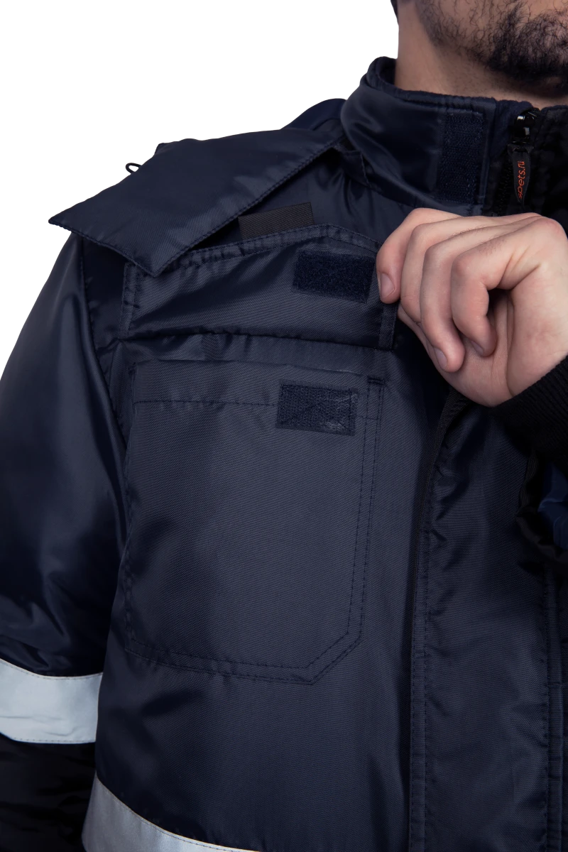 • пять карманов (верхние накладные с клапаном с застежкой на ленту-контакт, нижние с клапаном с горизонтальным входом, внутренний карман на левой полочке с застежкой на тесьму-молнию)