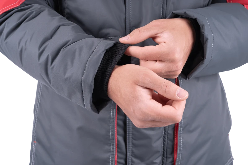 Костюм мужской ЕНИСЕЙ от пониженных температур воздуха и ветра, механических воздействий и ОПЗ (куртка, полукомбинезон), серый/красный