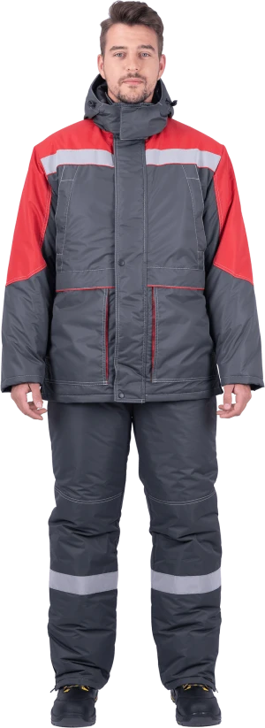 Костюм мужской ЕНИСЕЙ от пониженных температур воздуха и ветра, механических воздействий и ОПЗ (куртка, полукомбинезон), серый/красный