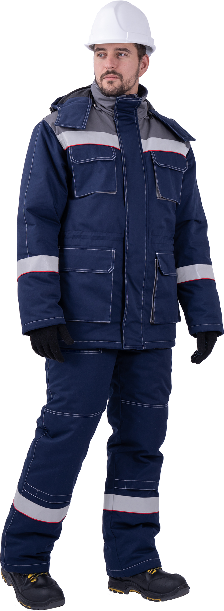 В костюме используются ветрозащитная ткань и световозвращающая полоса (СВП) 50 мм.