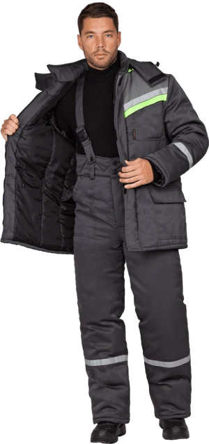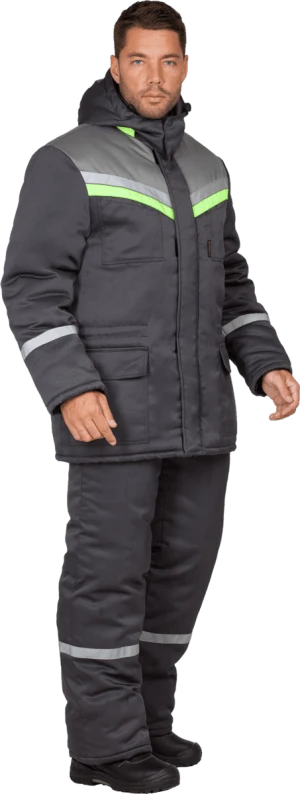 Костюм состоит из куртки и брюк. В костюме используется световозвращающая полоса