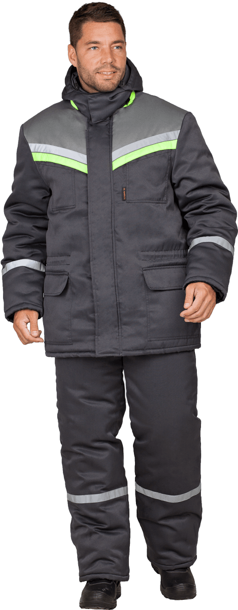 Костюм состоит из куртки и брюк. В костюме используется световозвращающая полоса