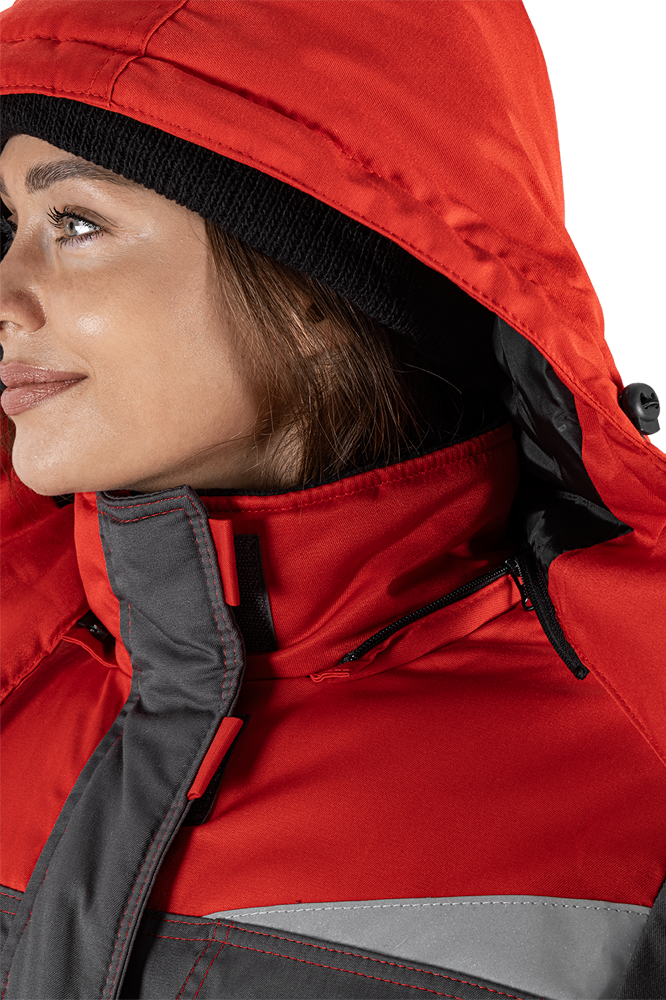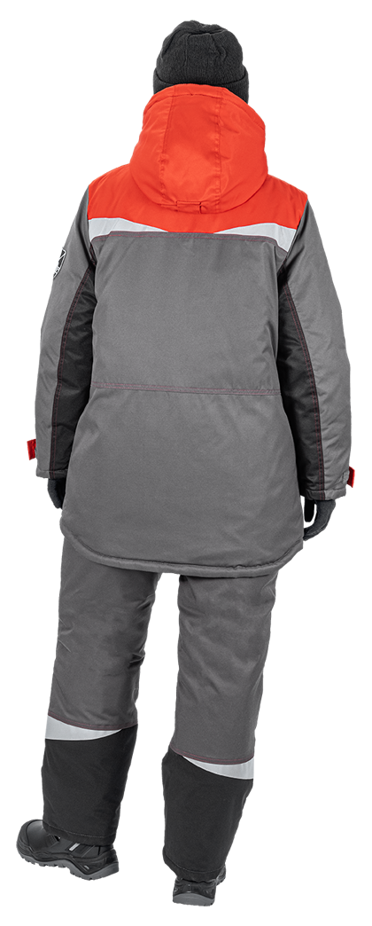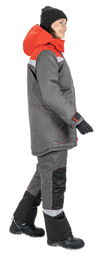 Костюм женский КМ-10 ЛЮКС от пониженных температур воздуха и ветра, механических воздействий и ОПЗ (куртка, брюки), серый/красный/черный