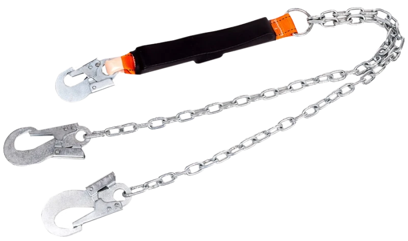 Строп из металлической цепи ф6 мм двухветьевой комбинации с амортизаторои и тремя карабинами используется как средство индивидуальной защиты от падения с высоты, может применяться как отдельная соединительная деталь, узел или компонент в системе с привязями и с анкерной точкой.